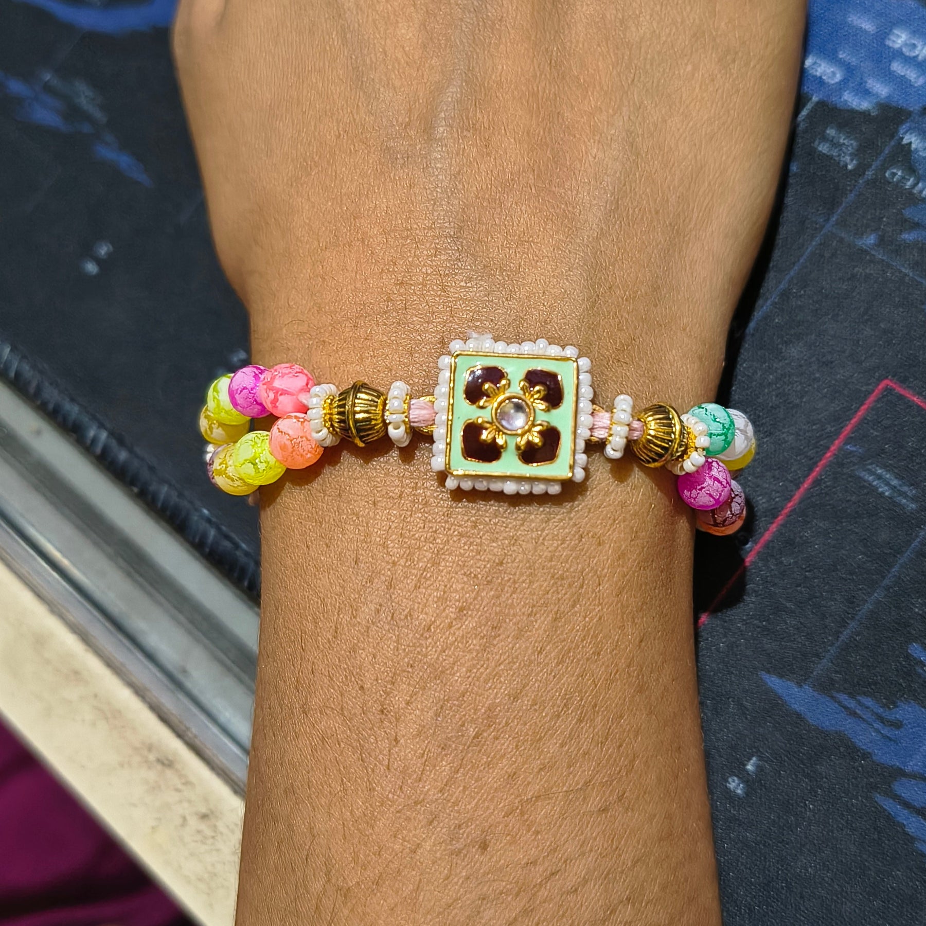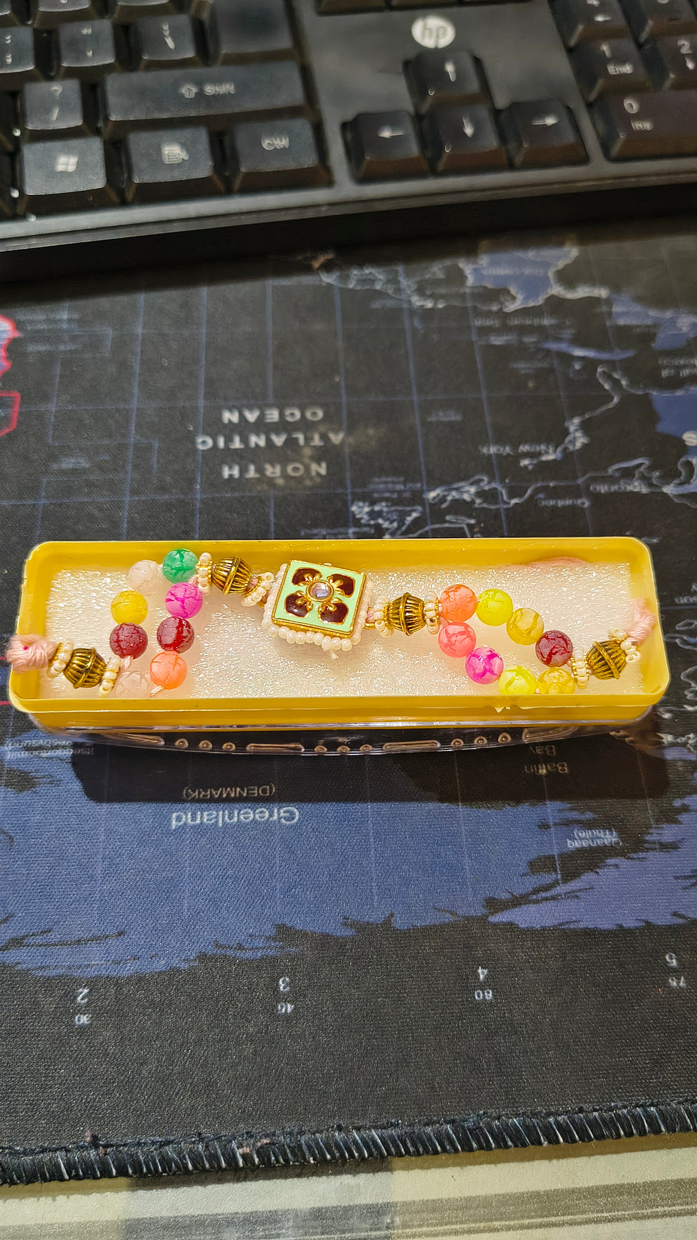Make this Raksha Bandhan extra special with our Premium Designer Moti Rakhi, a timeless symbol of love and tradition. Adorned with exquisite pearls (moti) and intricate craftsmanship, this rakhi exudes elegance and sophistication. The luxurious design reflects purity and prosperity, making it the perfect choice for your beloved brother. Crafted with care and attention to detail, this rakhi blends modern style with traditional values, ensuring your sibling feels cherished on this auspicious occasion. Celebrate your bond with a rakhi that radiates beauty and blessings.