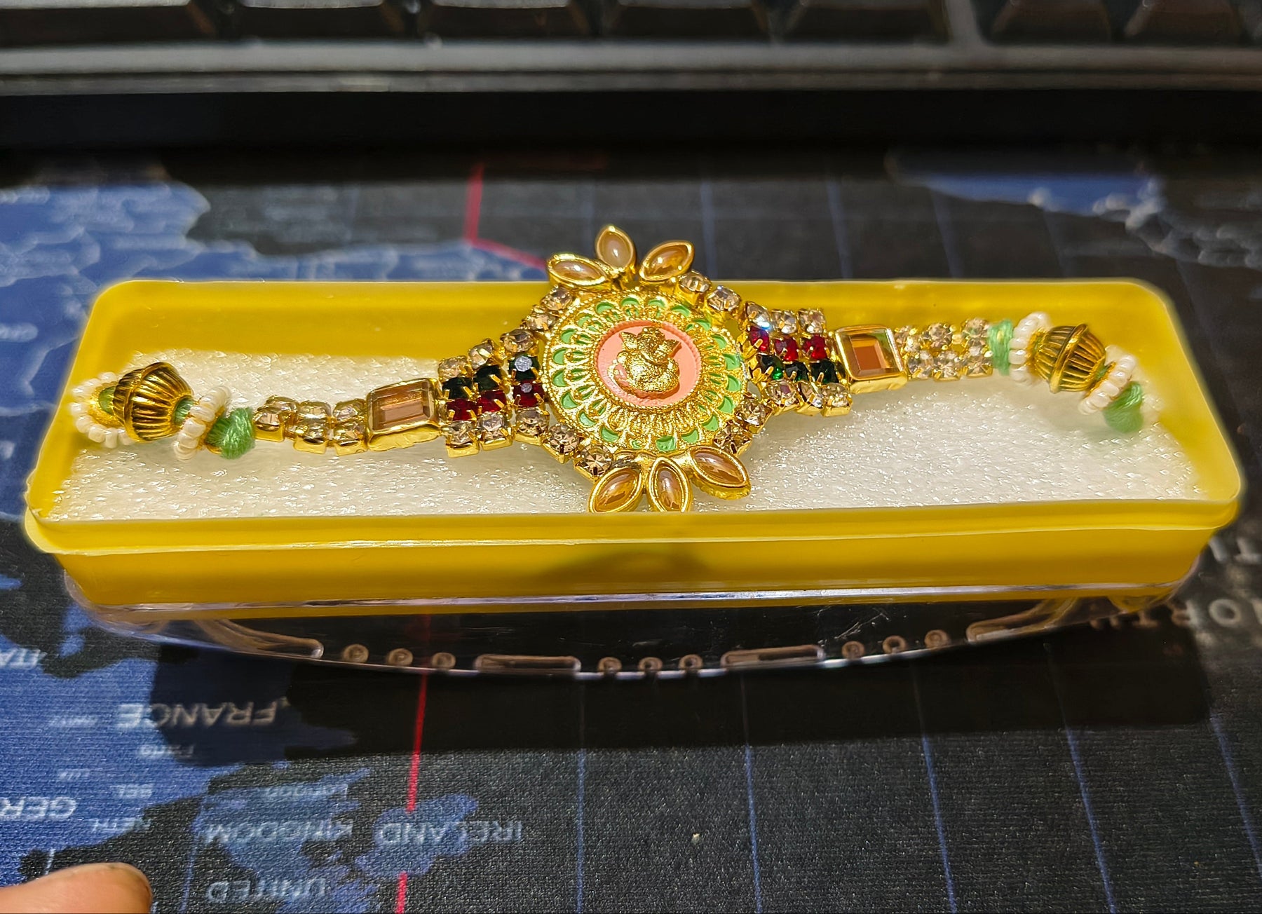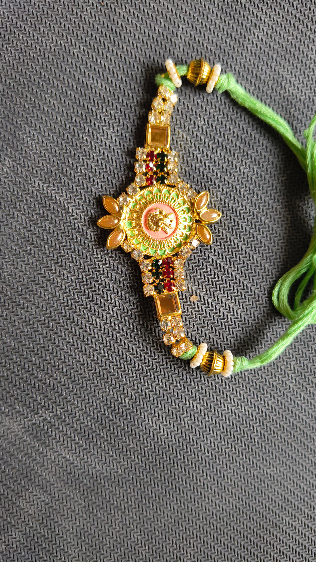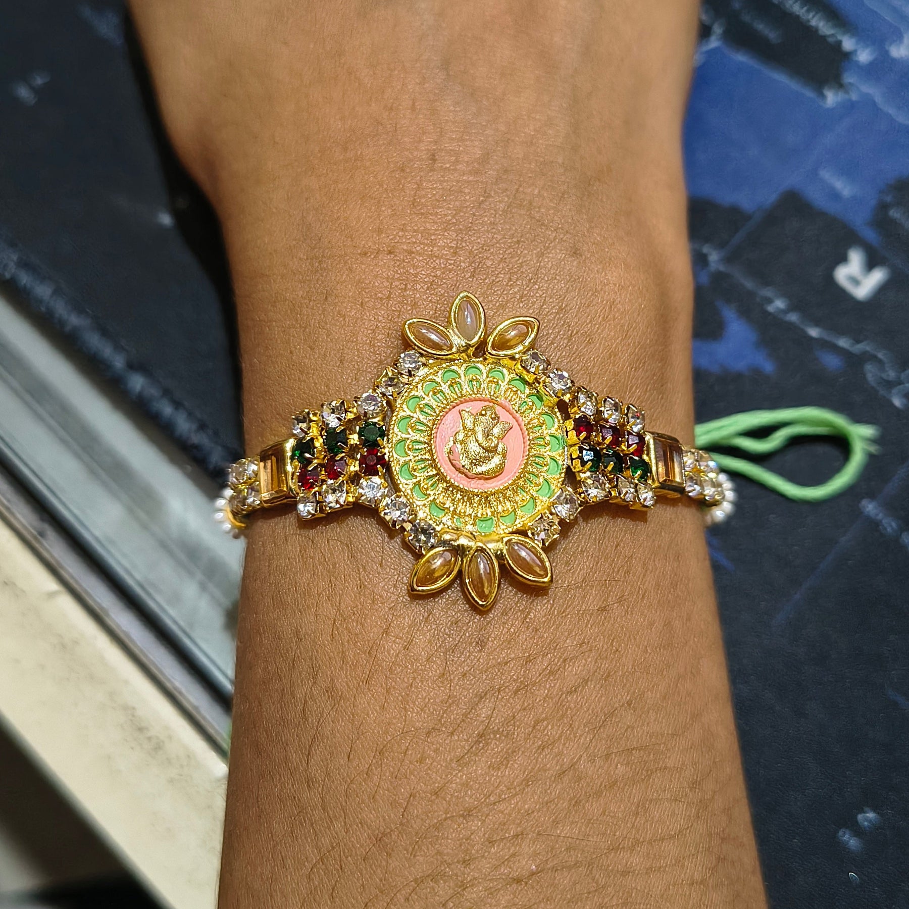 Celebrate Raksha Bandhan with divine blessings! Our Ganeshji Designer Rakhi is beautifully crafted to embody the grace and wisdom of Lord Ganesha. Adorned with intricate designs and premium embellishments, this rakhi symbolizes prosperity, good fortune, and the removal of obstacles. Perfect for honoring the sacred brother-sister bond, it is a thoughtful gift that brings blessings for both your sibling and family. Customize it with your choice of design and make this festival truly special!